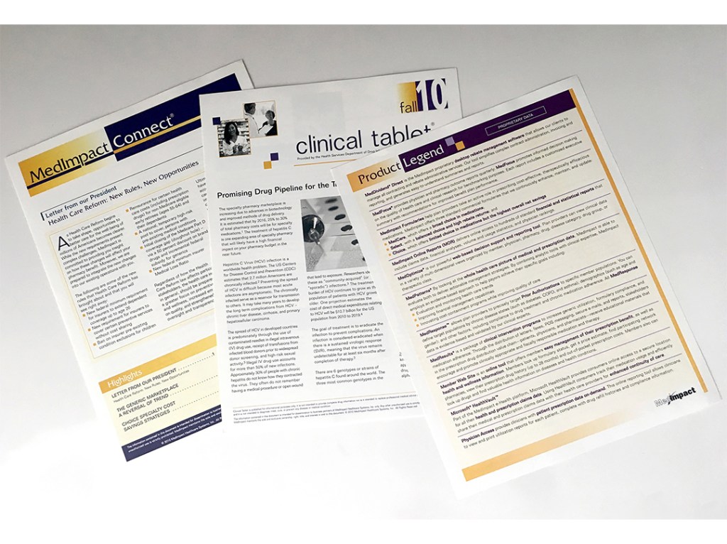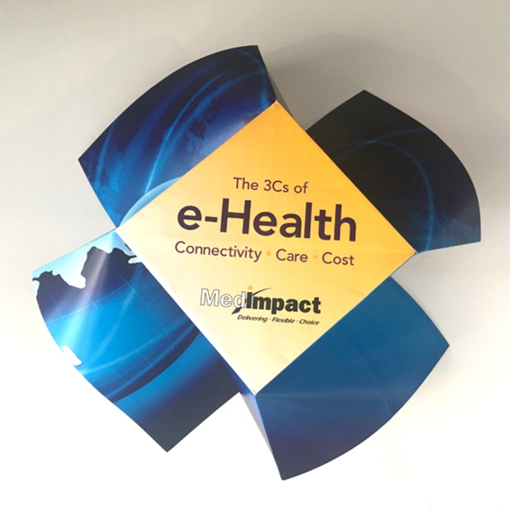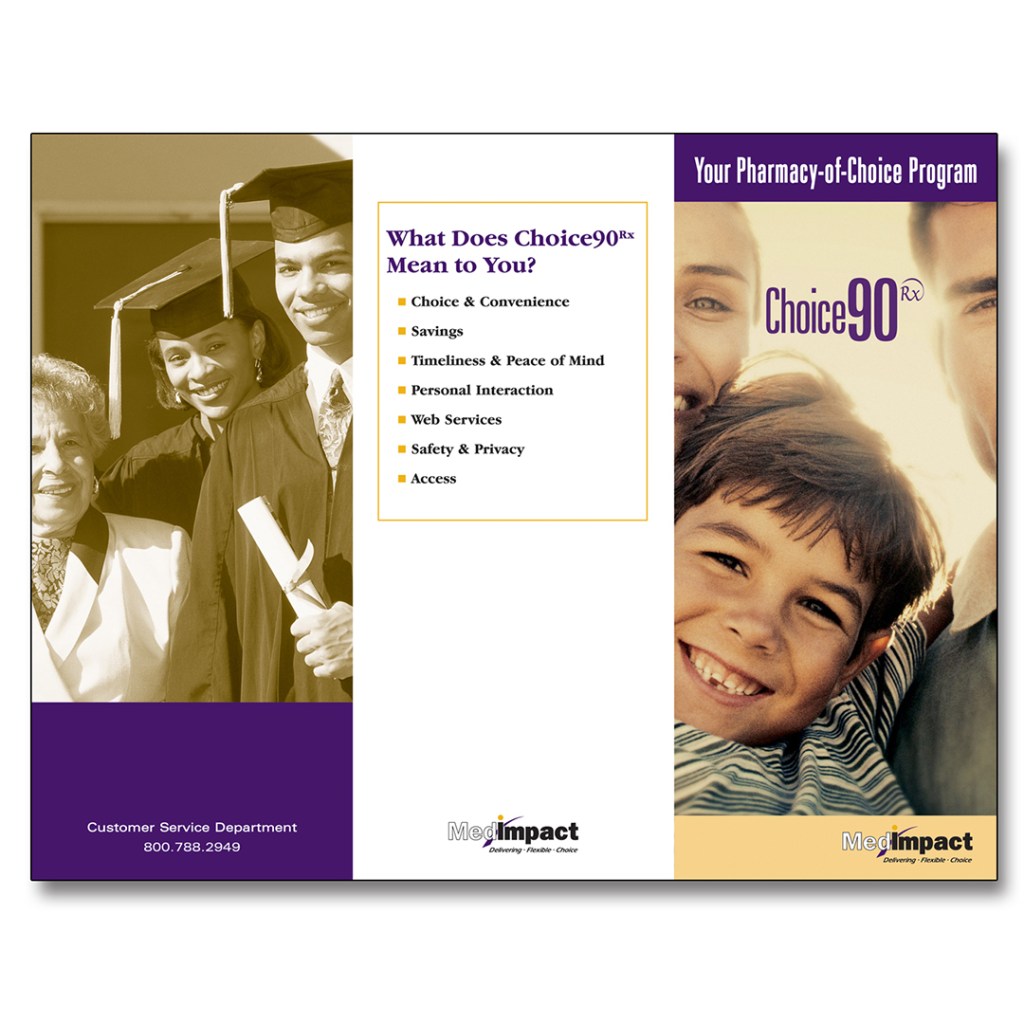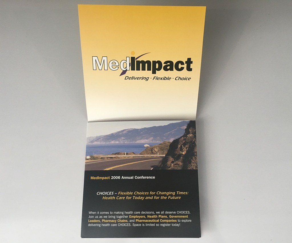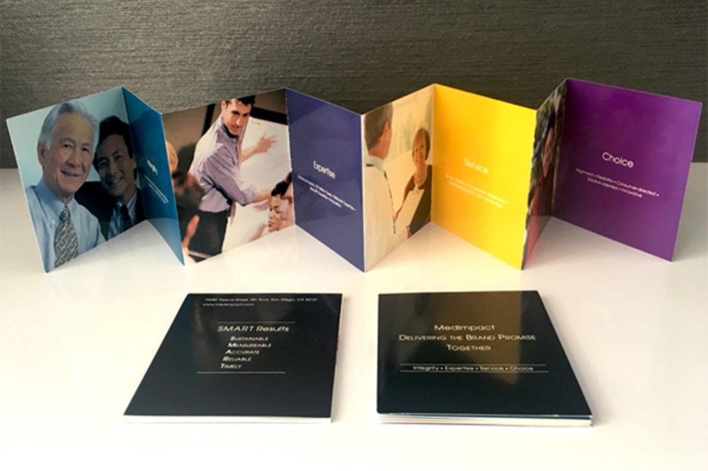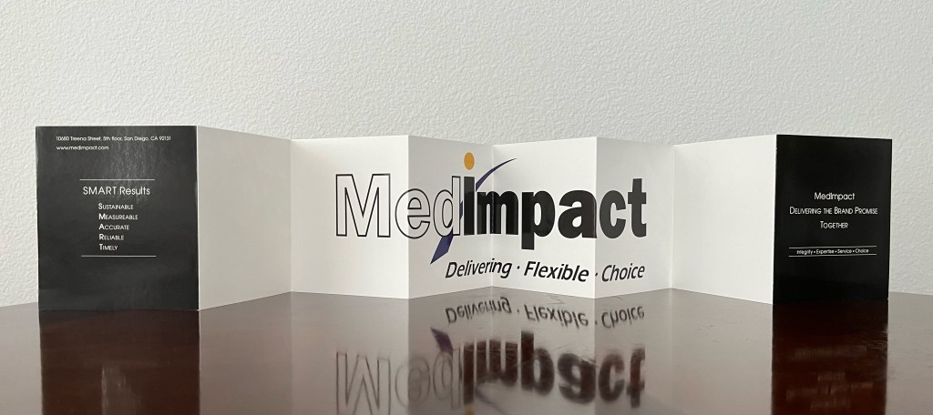 - Accordion Fold Handout opens to the newly branded images and branded colors for MedImpact